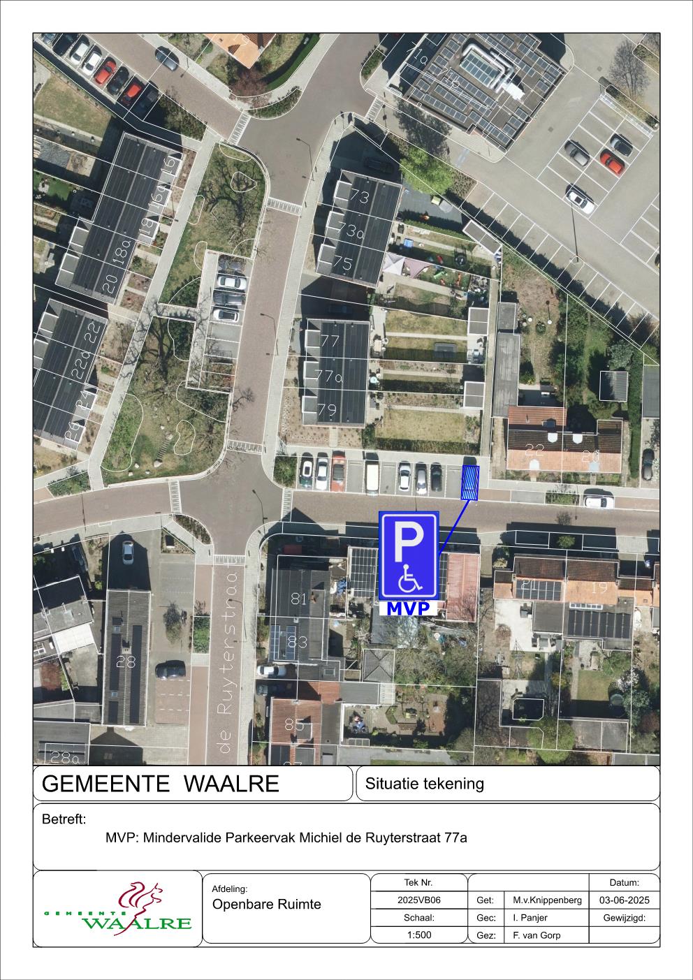 Tot het aanleggen van een individuele gehandicaptenparkeerplaats aan de Michiel de Ruyterstraat 77a te Waalre, middels plaatsing van bord E06 RVV in combinatie met een kentekenplaat, conform bijbehorende tekening.