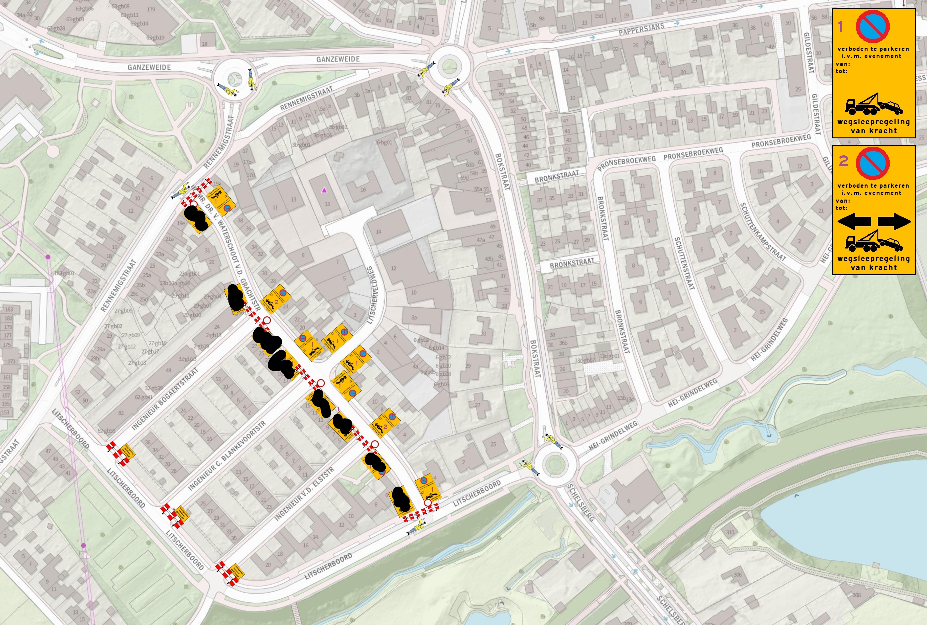 2) Door middel van de plaatsing van de verkeersborden E1 (Parkeerverbod) van bijlage 1 van het Reglement verkeersregels en verkeerstekens 1990 voorzien van onderborden met tekst “verboden te parkeren i.v.m. evenement van: 29/06/2025 11.30 uur tot 29/06/2025 14.00 uur aan zijde van de even huisnummers van de Ir. Mr. Dr. Van Waterschoot van der Grachtstraat én aan beide zijden van de Litscherveldweg”, het parkeren te verbieden. Dit zoals aangegeven op de bij dit besluit behorende tekening. De wegsleepregeling is van toepassing.
