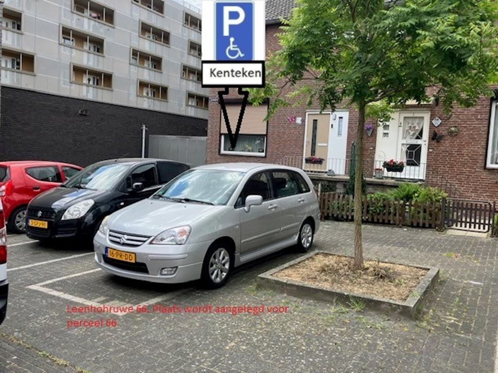 Er is een verzoek ingediend om een individuele gehandicaptenparkeerplaats te reserveren in de Leen-hofruwe, ter hoogte van huisnummer 66. De aanvrager kan zich namelijk niet of slechts met grote moei-te anders dan over een korte afstand te voet voortbewegen.
