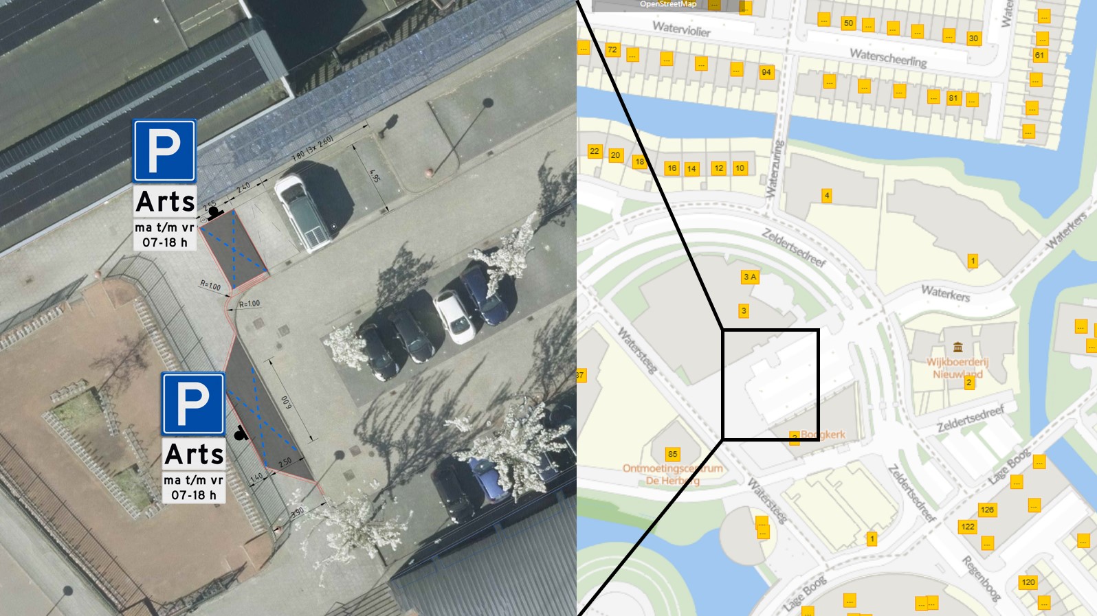 Op de Zeldertsedreef 9 is de huisartsenpraktijk “Watersteeg” gevestigd. Ten oosten van de huisartsenpraktijk is Sporthal Nieuwland gevestigd. Ter hoogte van Sporthal Nieuwland is een parkeerterrein aanwezig dat op loopafstand ligt van de huisartsenpraktijk.