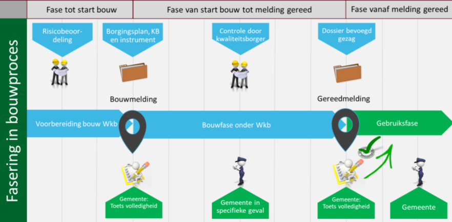 Een belangrijke plek in het bouwproces wordt ingenomen door de bouwmelding en de gereedmelding. Door de initiatiefnemer wordt een kwaliteitsborger (KB) in de arm genomen die voorafgaand aan de bouw een risicobeoordeling maakt en een borgingsplan vaststelt. De initiatiefnemer dient tenminste 4 weken voor aanvang van de bouw (maar niet eerder dan een jaar van tevoren) in een bouwmelding informatie te overleggen over de ingehuurde kwaliteitsborger, het gebruikte ‘instrument’, een risicobeoordeling en het daarop gebaseerde borgingsplan.