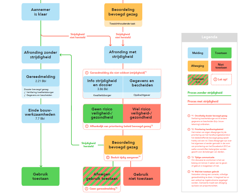 De gemeente blijft wettelijk belast met het toezicht op de naleving van bouwtechnische eisen van bouwwerken. Signalen dat er niet voldaan wordt aan deze eisen kunnen dan ook niet genegeerd worden. Het bevoegd gezag heeft een beginselplicht om te handhaven. Maar in specifieke situaties kan worden afgezien van handhaving en kan het bevoegd gezag het bouwwerk tóch in gebruik laten nemen als een goedkeurende verklaring van de kwaliteitsborger ontbreekt, of bij het ontbreken van andere documentatie.