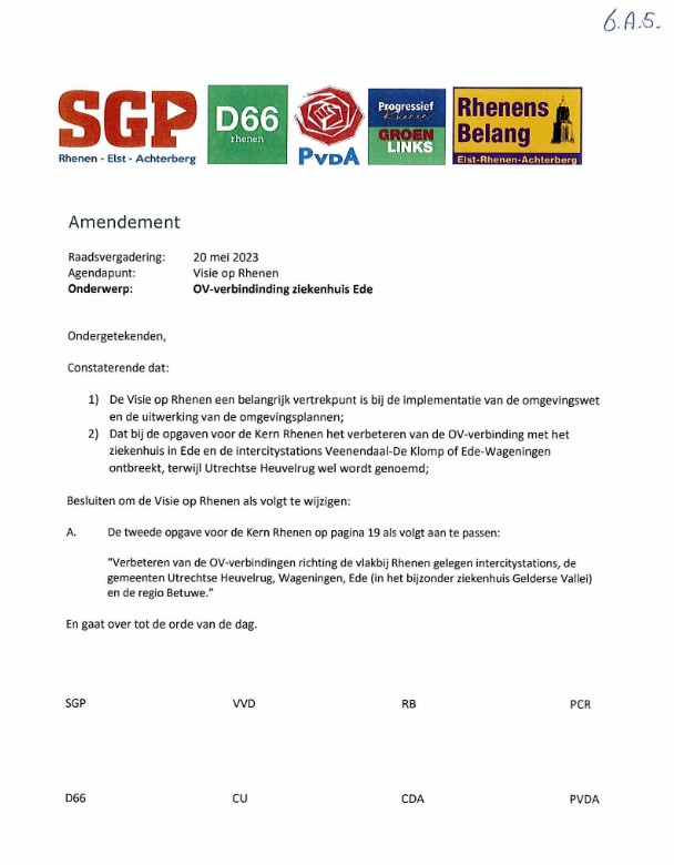 De Visie op Rhenen antwoordt op deze vraag als volgt: er is deelvervoer geïntroduceerd in de gemeente. Ook verplaatsen wij ons meer door middel van lopen en fietsen. Dit laatste kan door een beter netwerk aan fietspaden. We blijven dus mobiel en bereikbaar, maar op een gezonde manier. Daarnaast rijden er minder auto’s en vrachtwagens door het stadscentrum van Rhenen (D1) en Elst (D3). Dit komt de leefbaarheid ten goede.