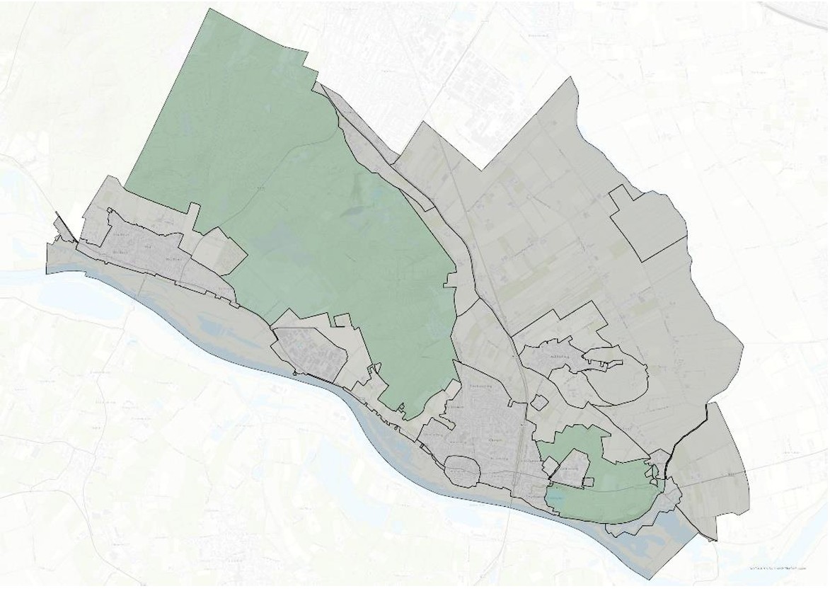 De nagenoeg onbebouwde gebieden zoals de uiterwaarden, de Utrechtse Heuvelrug en het agrarisch gebied.