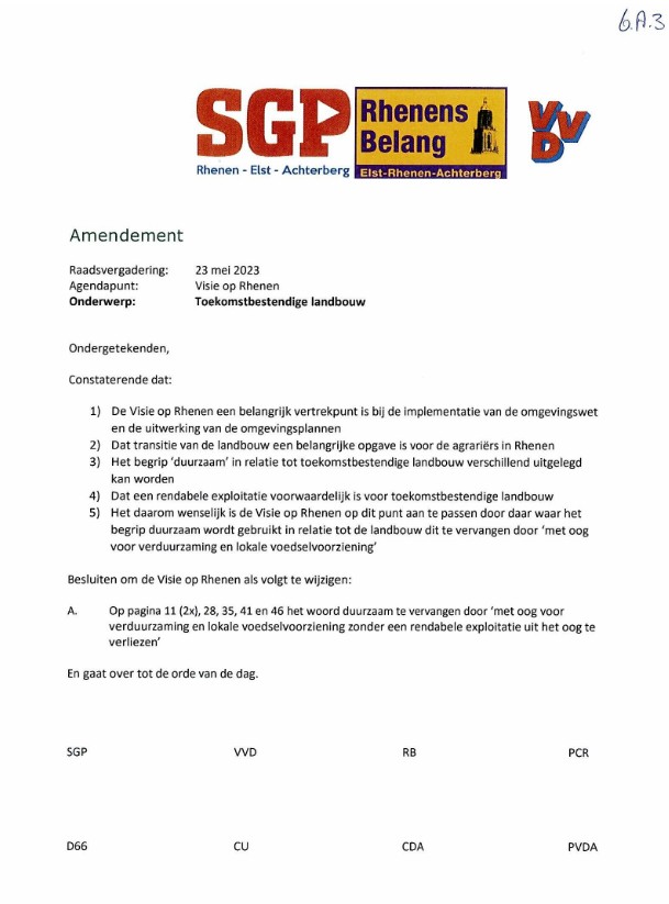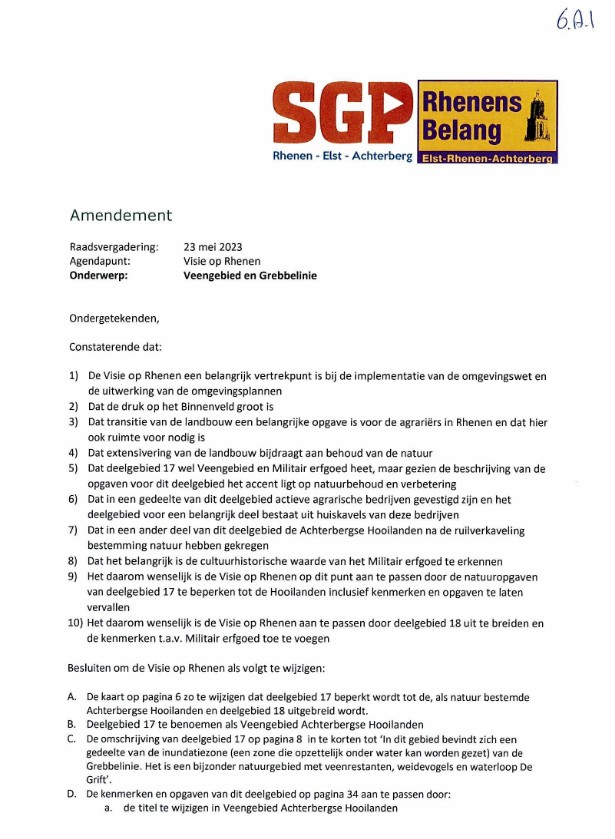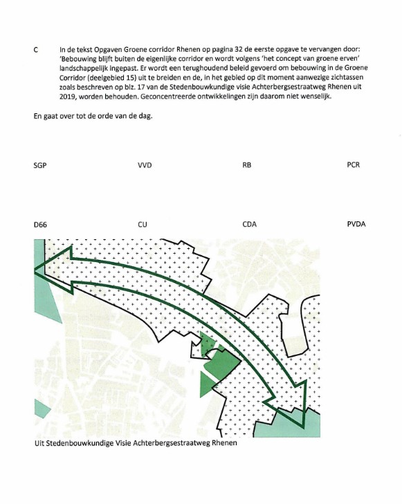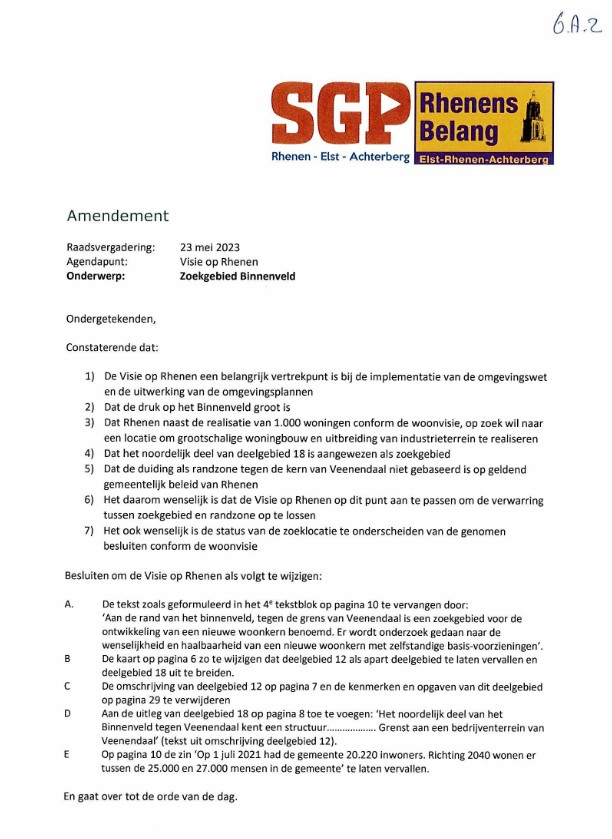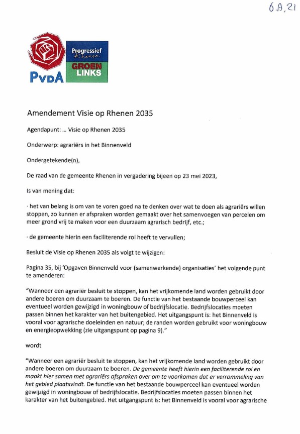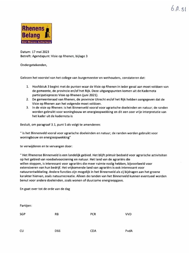 is het Rhenense Binnenveld een landelijk gebied. Het blijft primair bedoeld voor agrarische activiteiten op het gebied van voedselvoorziening en natuur. Het land van de agrariërs die willen stoppen, is interessant voor agrariërs die meer ruimte nodig hebben, bijvoorbeeld voor het extensiveren van hun bedrijf. Het vrijkomende land van agrariërs is ook interessant voor natuurontwikkeling. Andere functies zijn mogelijk in het Binnenveld als zij bijdragen aan het groene karakter hiervan, zoals natuurrecreatie. Alleen de randen van het Binnenveld kunnen eventueel worden benut voor andere doeleinden, zoals wonen of de duurzame energieopgave;