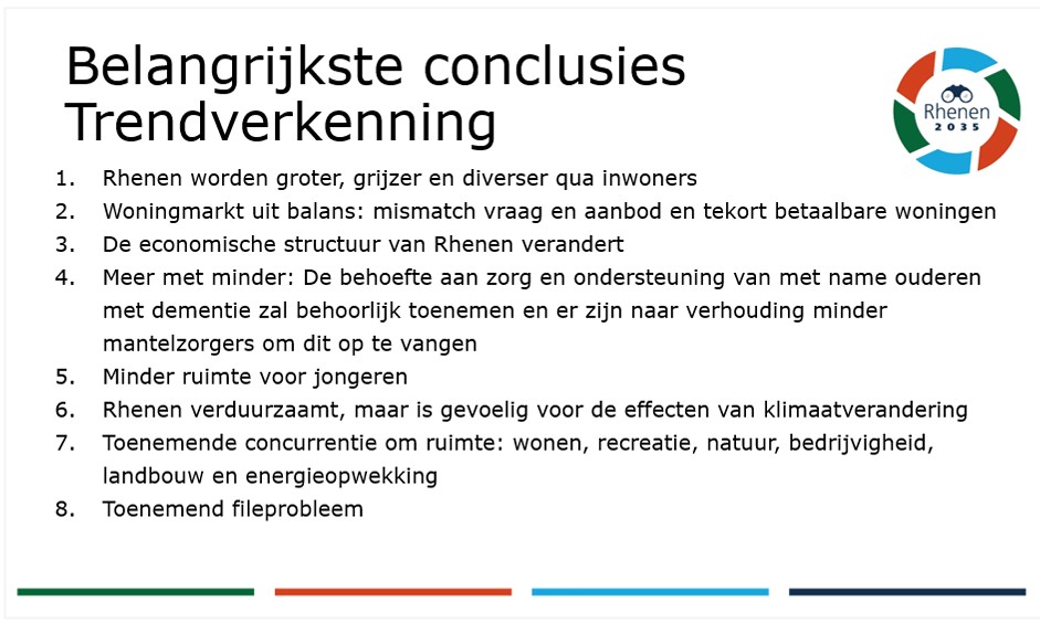 De Visie op Rhenen houdt rekening met ontwikkelingen in de maatschappij. Hier is onderzoek naar gedaan. In bijlage 3 staan de belangrijkste conclusies van dit trendonderzoek en deze vormen een integraal onderdeel van de Visie op Rhenen.