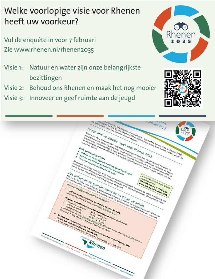 De inwoners, ondernemers, gemeente en organisaties van Rhenen hebben samen drie voorlopige visies opgesteld. Het gemeentebestuur heeft gekozen voor deze Visie op Rhenen. Deze keuze is mede gebaseerd op een advies van de gemeenschap.
