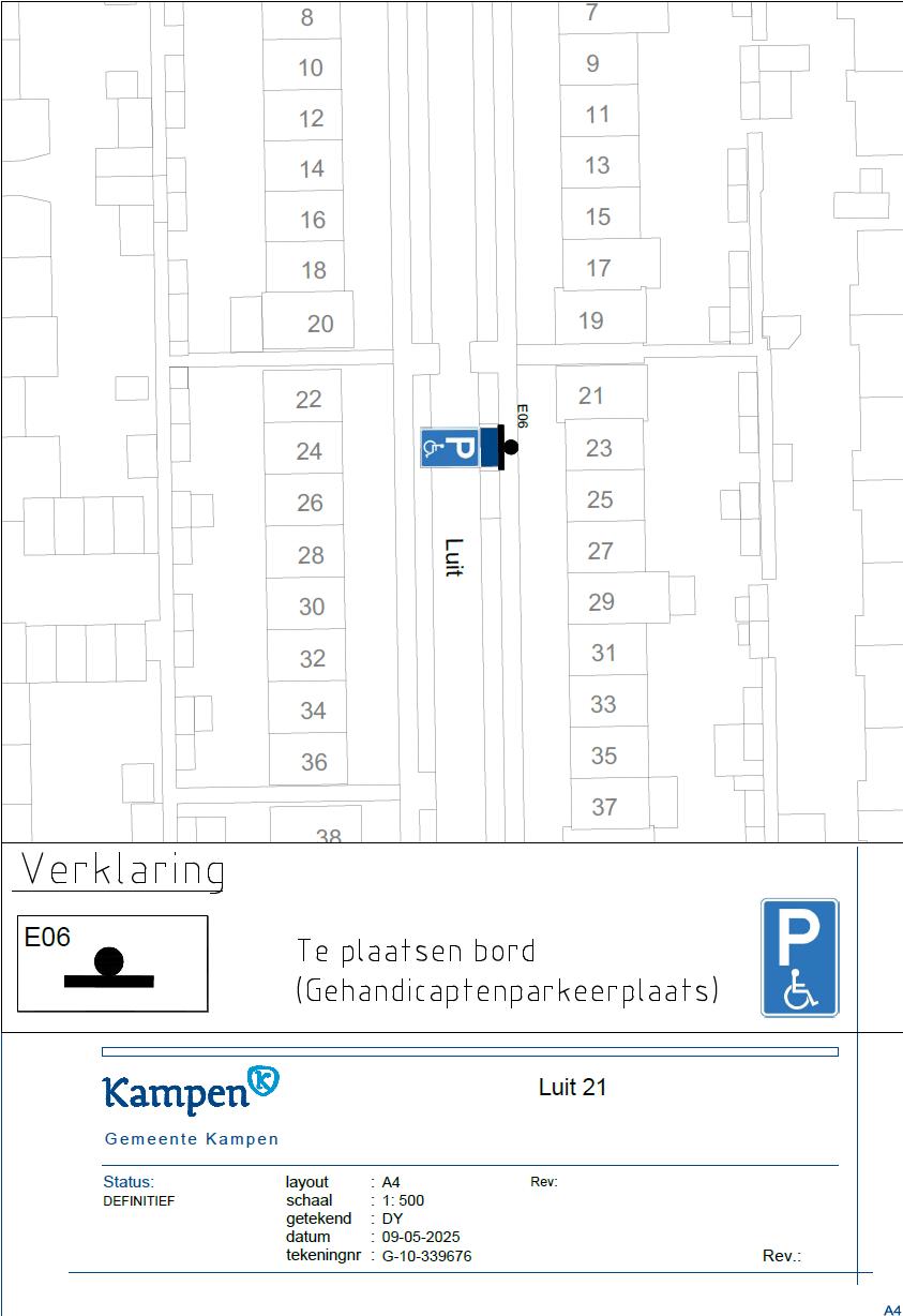 - de gemeente Kampen op 25 februari 2025 verkeersbesluit 75647 heeft gepubliceerd met zaaknummer: 10700-2025, met daarin het voornemen om één openbare parkeerplaats aan te wijzen als gehandicaptenparkeerplaats op kenteken nabij Luit 21;