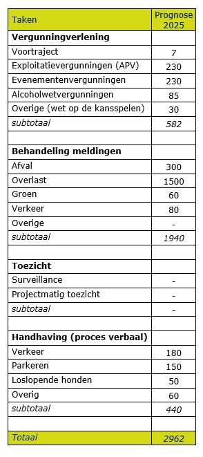 Onderstaande tabel bevat de raming voor de productie en inzet van vergunningverlening, toezicht en handhaving in 2025. De raming is gebaseerd op de ervaringen van de afgelopen jaren en op basis van de controlefrequenties uit het VTH-beleidsplan. Daar waar geen kengetallen beschikbaar of de inzet niet in kengetallen uitdrukt kan worden, is een inzetraming gegeven.