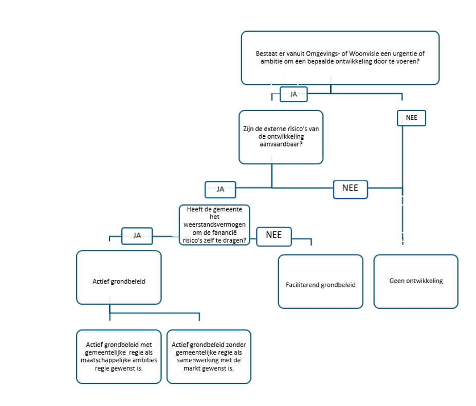 De volgende beslisboom beschrijft, in grote lijnen, welke vorm van grondbeleid zal worden gekozen bij een ruimtelijke ontwikkeling in relatie tot de overige doelen. Hierbij is als voorbeeld de Omgevings- of Woonvisie gekozen waarbij ook andere visies leidend kunnen zijn voor het verder doorlopen van de beslisboom: