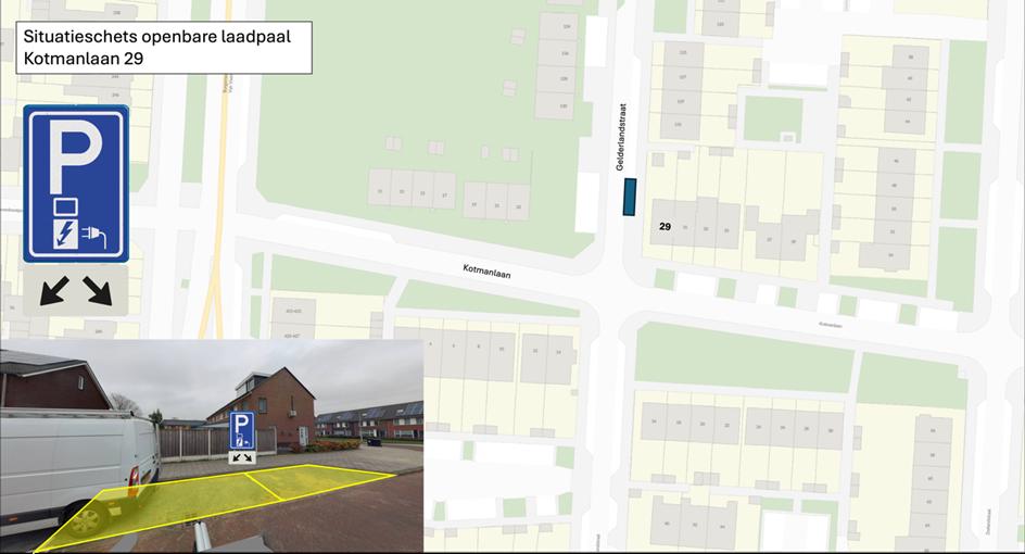 door middel van het plaatsen van het verkeersbord E8c van bijlage 1 van het RVV 1990 met een onderbord met pijlen, waaruit blijkt dat het bord voor twee parkeerplaatsen van toepassing is op de Gelderlandstraat ter hoogte van Kotmanlaan 29, een tweetal parkeerplaatsen te reserveren ten behoeve van het opladen van elektrische voertuigen.