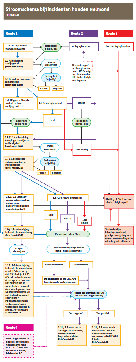 In het geval een hond meteen een ernstig bijtincident veroorzaakt, wordt route 2 van het stroomschema gevolgd (zie paarse lijn). Die route wordt ook gevolgd als zich na een licht bijtincident (met voorafgaande waarschuwing) een ernstig bijtincident voordoet. Het is ook mogelijk dat na een ernstig bijtincident een licht bijtincident volgt. In dat geval wordt niet afgeweken van route 2.