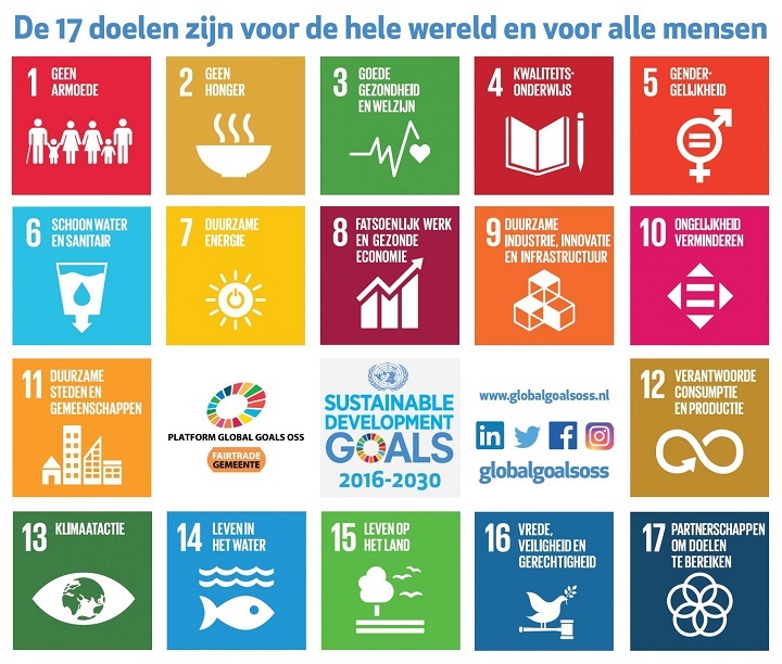Oss heeft zich verbonden met de Global Goals van de Verenigde Naties (VN), de duurzame ontwikkelingsdoelen voor 2016-2030. In Oss brengen we de Global Goals ‘van veilig ver weg naar concreet dichtbij’. Op haar eigen lokale manier draagt Oss bij aan de 17 wereldwijde doelen. We vertalen de Global Goals ook nadrukkelijk door in onze omgevingsvisie, het gaat o.a. om de doelstellingen: goede gezondheid en welzijn, schoon water en sanitair, betaalbare en duurzame energie, eerlijk werk en economische groei, industrie, innovatie en infrastructuur, duurzame steden en gemeenschappen, verantwoorde consumptie en productie, klimaatactie, leven op het land en partnerschap om doelstellingen te bereiken.