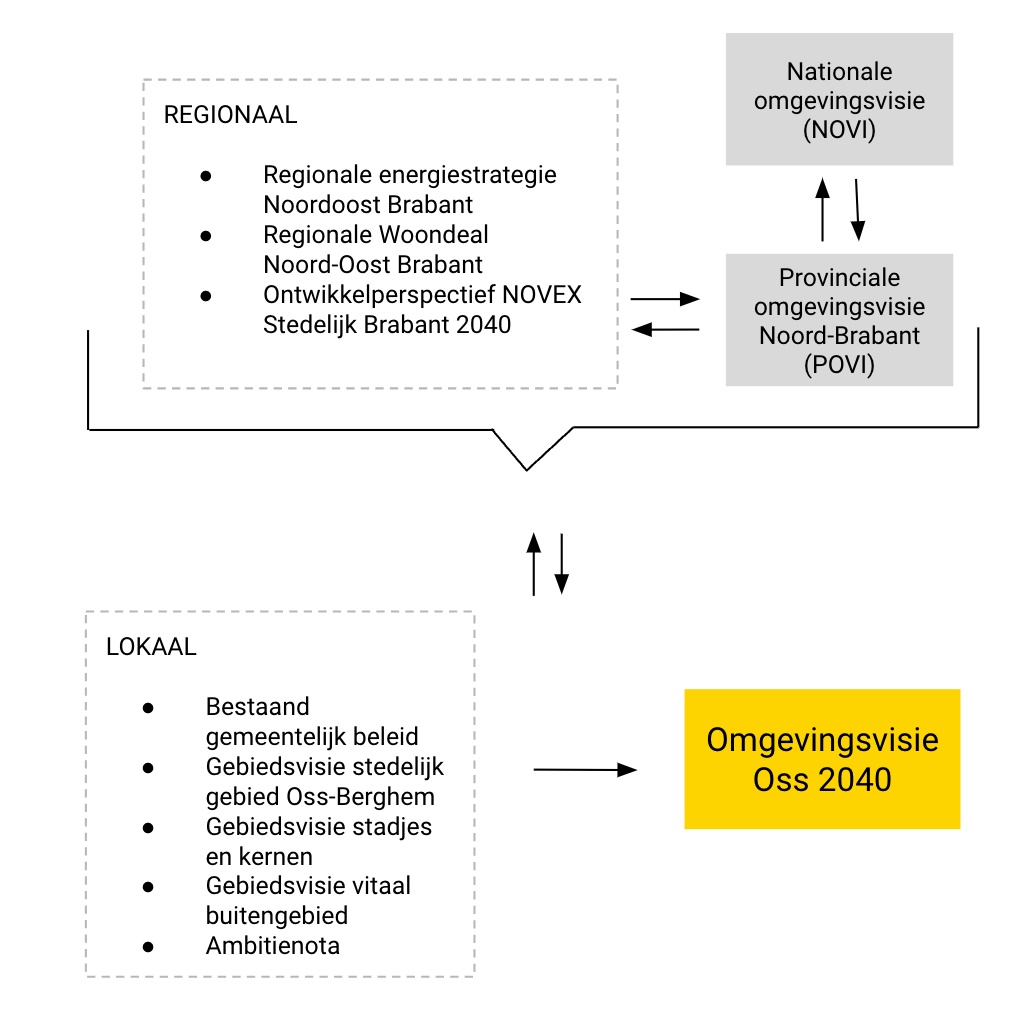 Met deze omgevingsvisie willen we inwoners, ondernemers, maatschappelijke organisaties én de gemeentelijke organisatie houvast bieden bij het ontwikkelen en uitvoeren van plannen voor wonen, werken en leven in de gemeente Oss. De omgevingsvisie geeft antwoord op lokale opgaven, terwijl we tegelijkertijd aandacht hebben voor een goede borging van ontwikkelingen en richtlijnen op hogere schaalniveaus. We moeten dus ook buiten onze gemeentegrenzen kijken naar de regionale, provinciale en nationale context: wat speelt er en op welke manier raakt dit de Osse leefomgeving? De keuzes die we maken moeten aansluiten bij de ontwikkelingen, ambities en beslissingen op hoger schaalniveau (nationaal, provinciaal en regionaal). Wet- en regelgeving, beleid en richtlijnen bepalen de bewegingsruimte waarbinnen de omgevingsvisie voor de gemeente Oss vorm krijgt.