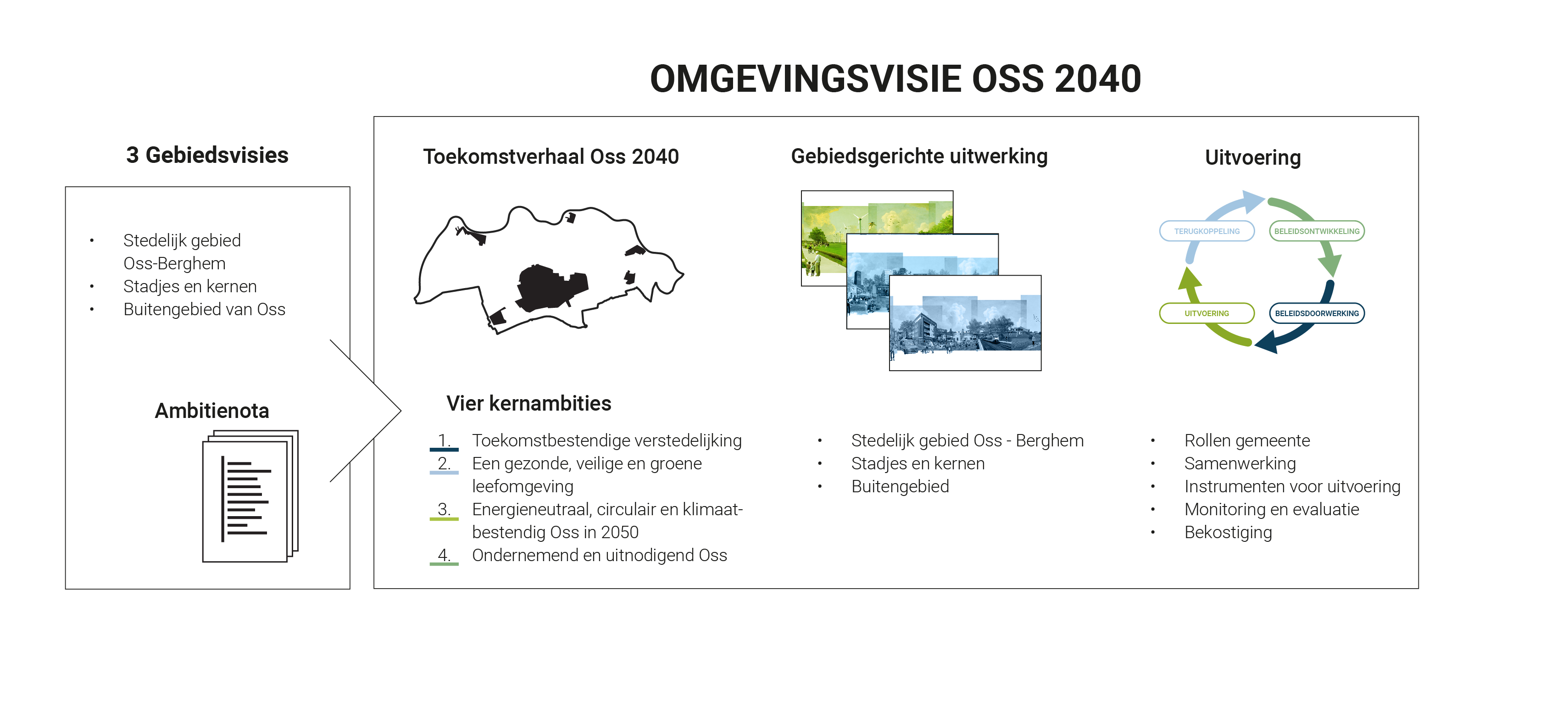 De gemeente Oss is gestart met het uitwerken van drie gebiedsvisies: stedelijk gebied Oss-Berghem, de stadjes en kernen en het buitengebied van Oss. In deze gebiedsvisies is een uitvoerige analyse van de gebieden gemaakt, zijn de ontwikkelingen die op de gebieden afkomen geschetst en worden de belangrijkste opgaven uiteengezet. Volgend op deze analyse is de koers uitgezet voor de drie deelgebieden van de gemeente Oss. Deze koers is per gebied op detailniveau uitgezet en vormt een waardevolle basis voor de omgevingsvisie. Daarnaast is er een gemeentebrede ambitienota opgesteld, waar de uitgangspunten voor de koers voor de gemeente als geheel zijn beschreven. Deze vier documenten vormen, naast ander bestaand gemeentelijk beleid, de basis voor de omgevingsvisie.