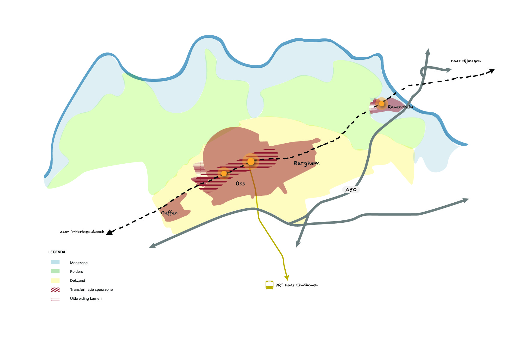 De gemeente Oss staat voor een schaalsprong met betrekking tot verstedelijking. Het ontwikkelperspectief voor de Spoorzone in Oss zet in op transformatie van dit gebied naar een hoogstedelijk woon- werkmilieu dat daarnaast bijdraagt aan de mobiliteitsopgave in de stad. Hier liggen kansen de ruimte in de spoorzone (het stedelijk gebied rondom het spoor) en het centrum anders te benutten: met meer ruimte voor fietsers en voetgangers in groene, hoogwaardige openbare ruimte en een aantrekkelijk woon- en verblijfsklimaat. Door de ontwikkeling van de Spoorzone in Oss komt er een aantrekkelijk stedelijk woonmilieu in de stad bij om in te wonen en een toekomstbestendige ontwikkeling van het stadshart en stationsgebied met oog voor gezondheid. Oss vormt zo een aantrekkelijke stedelijke hub tussen Den Bosch en Nijmegen.
