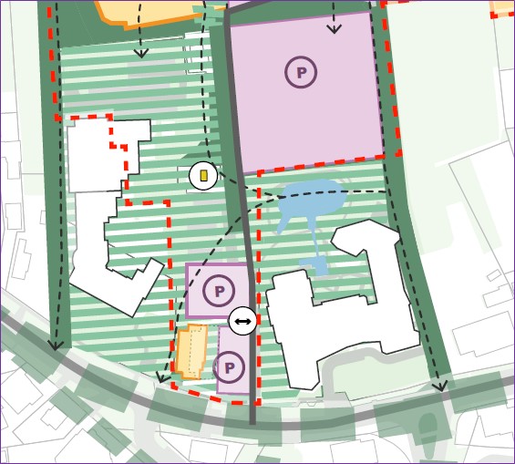 We realiseren nieuwe functies in een gebied. We vinden het belangrijk dat de verschillende functies in het gebied goed ontsloten worden. Om het groene hart van het gebied autovrij te maken komt er één toegangsweg vanaf de hoofdstraat naar de parkeerplaats. Deze toegangsweg gaan we iets verbreden zodat het goed mogelijk is dat auto’s elkaar passeren. Via deze weg is het ook mogelijk de nieuwe woongebieden te bereiken. Deze toegangswegen richten we zo in dat het voor bezoekers niet aantrekkelijk is om de woongebieden in te rijden. Dit doen we bijvoorbeeld door andere afmeting of ander materiaal voor de weg te gebruiken of de overgang naar het woongebied met een fysieke drempel o.i.d. vorm te geven.