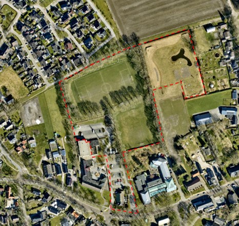 In de volgende afbeelding is het gebied aangegeven waar dit omgevingsprogramma (Programma Exloo) over gaat. Kort gezegd gaat het over het gebied achter en naast het gemeentehuis. De voetbalvelden, de beweegtuin en de parkeerplaats. De school, sporthal en het dorpshuis vallen niet binnen het programma. De kantine en kleedkamers van HOVC en de Smidswal vallen ook binnen het omgevingsprogramma.