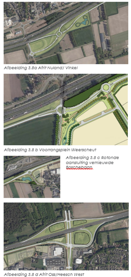 De zuidelijke af-/toerit op de A59 bij Nuland wordt aangepast, waarmee een directe route tussen inkomend verkeer uit de richting ’s-Hertogenbosch en het bedrijventerrein wordt gerealiseerd. Dit ontlast de Van Rijckevorselweg. Bij de afrit Oss/Heesch-West wordt in samen- hang met een nieuwe parallel aan de A59 gelegen verbindingsweg het kruispunt aangepast met toegevoegde rijbanen om de afslaande bewegingen goed vorm te geven. De westelijk en oostelijke maatregelen voor de hoofdontsluiting van het bedrijventerrein zijn ook efficiënt voor algemeen regionaal verkeer. Dit leidt bijvoorbeeld op de bestaande Bosschebaan bij de entree van Heesch en op de Rijksweg-noord bij Nuland tot afname van bestaand regionaal verkeer.
