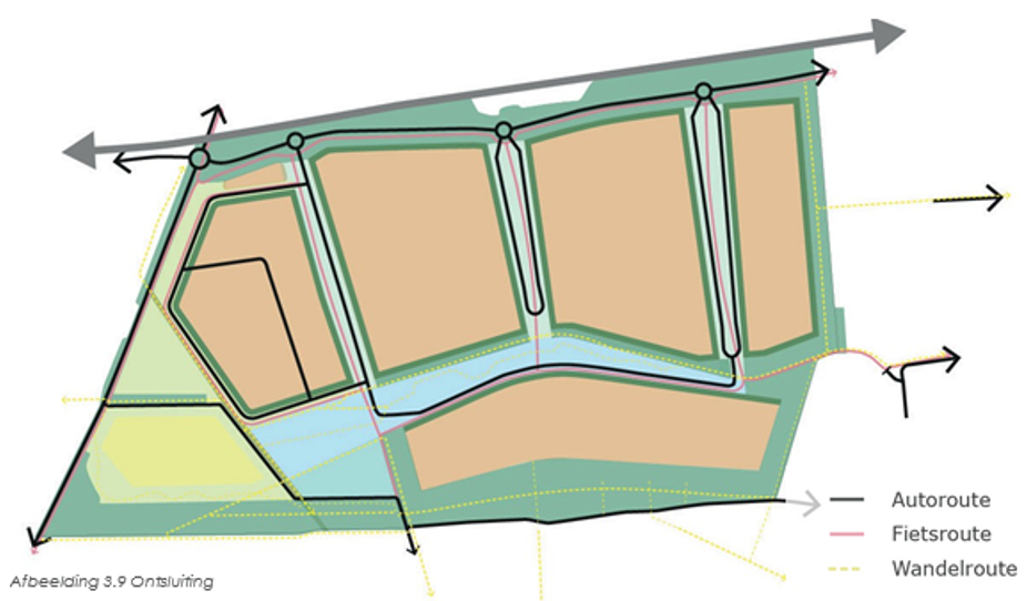 In deze paragraaf staat de algemene uitgangs- punten ten aanzien van de ontsluiting. De vormgeving en de uitwerking is nauw verbonden met de inrichting van het openbare gebied. Deze is opgenomen in het landschapsplan.