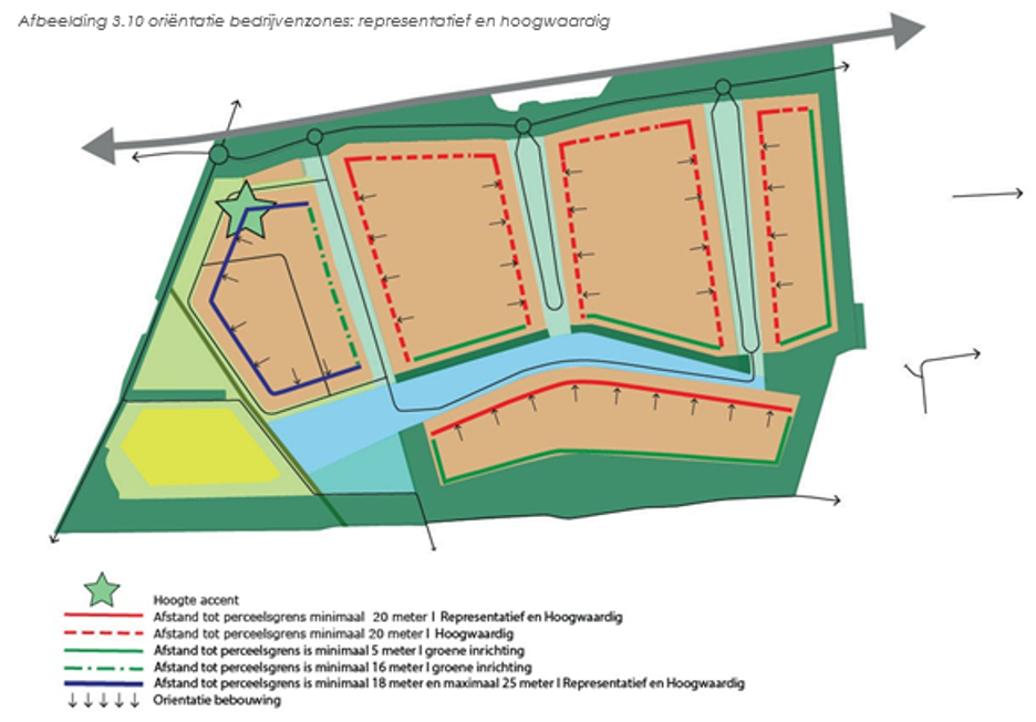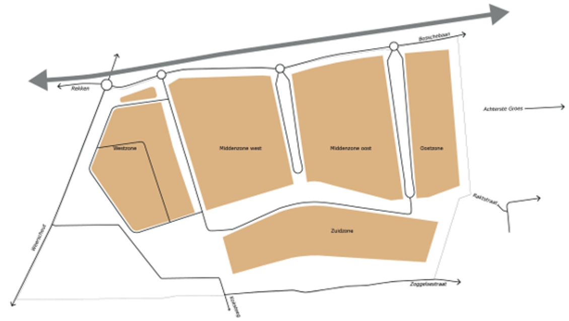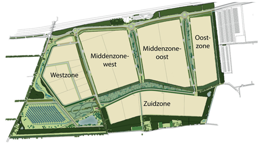 De stedenbouwkundige opzet van het bedrijventerrein deelt het gebied op in vijf kavelzones (westzone, middenzone west, middenzone oost, oostzone en zuidzone). Deze zones worden door het landschap ingekaderd met robuuste groen randen. De westzone wordt ontsloten vanaf de buitenzijde van het gebied.