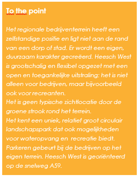Heesch West is nadrukkelijk geen anoniem, naar binnen gekeerd, afgesloten terrein exclusief voor bedrijven. Het is een overzichtelijk en toegankelijk gebied, uitnodigend voor bedrijven, haar werknemers, klanten én voor recreanten en omgeving.