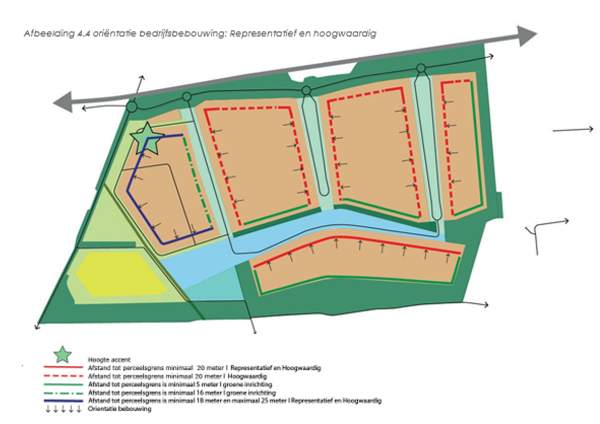 Naast de zichtlocatie zijn op het bedrijventerrein meer straatwanden waarvoor een representatief karakter wordt gevraagd. Het zijn de locaties die van invloed zijn op het beeld van het bedrijventerrein. Concreet zijn dit de gevels die aan het landschapspark liggen en daarbij in het zicht zijn en de gevels die de entree vormen tot de Parksingels (zie afbeelding 4.4).