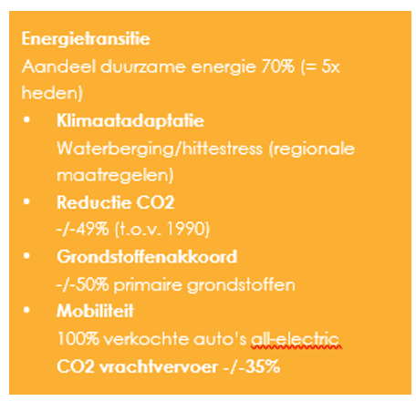 Om samen met de bedrijven concrete mogelijkheden aan te pakken worden 5 thema’s uitgewerkt: Energie, Klimaatadaptatie, Landschap en Biodiversiteit, Circulair bouwen en Mobiliteit.