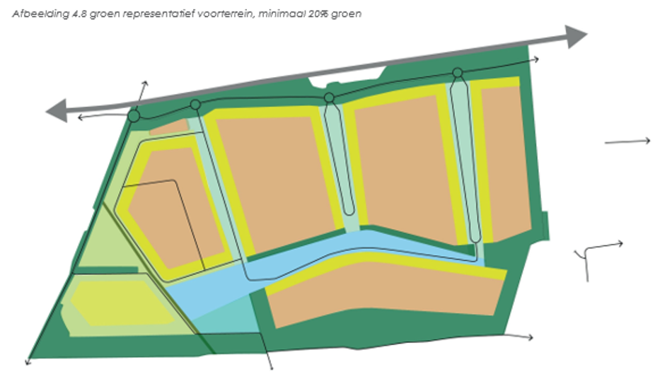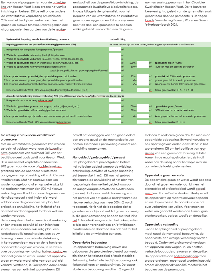 Voor de toevoeging van groen en blauw zijn bindende regels in het bestemmingsplan opgenomen (artikel 5.2.10 en 5.4.11), met een verwijzing naar de nadere uitwerking in dit Circulaire Kwaliteitsplan, (paragraaf 4.5 en voorliggend hoofdstuk 5). Dit houdt in dat minimaal 20% van het bedrijfsperceel ingericht moet worden voor groene en/of blauwe functies. Hieraan voldoen levert in principe een neutrale score op dit sub-aspect (0). Voor de wijze van interpretatie en berekening van de groen/blauwnorm, zie Bijlage Systematiek bepaling groennorm Heesch West.