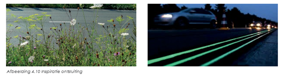 In de ontsluitingsstructuur ligt het accent op een rustige ligging in het landschap met zo min mogelijk verstoringen in de ruimtelijke beleving in het wijde landschap. Bijvoorbeeld door juist niet te kiezen voor hoge lantaarnpalen die de loop van de weg in het landschap nadrukkelijk markeren. Hierna wordt de beeldkwaliteit en duurzaamheid per deelgebied beschreven.
