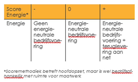 Door de opgenomen verplichtingen in het bestemmingsplan (duurzaam dakgebruik en aardgasvrij), zullen bedrijven al snel minimaal een 0 scoren op dit thema. Er is dan sprake van een energieneutrale bedrijfsvoering op basis van duurzame energie. Indien ook energie wordt teruggeleverd aan het net en er een sprake is van een (zeer) energiezuinig bedrijfsproces, is het aannemelijk dat bedrijven op dit thema een + scoren. Deze beoordeling is bedrijfsafhankelijk. Logistieke bedrijven hebben veel meer moge- lijkheden om veel zonnepanelen op het dak te leggen dan andere bedrijven en hebben daarmee meer mogelijkheden om een + te scoren.