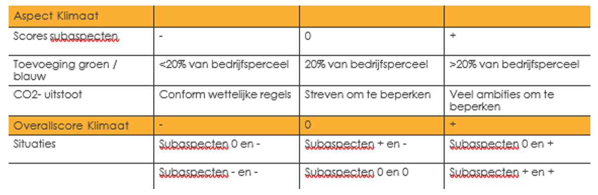Daarnaast zijn ook op perceelsniveau belang- rijke stappen te zetten in het licht van klimaat- adaptatie. Dat gaat om de fysieke toevoeging van ‘groen en blauw’(groenontwikkeling en wateropvang en -zuivering), maar ook over (beperking van) de CO2-uitstoot van de bedrijfs- voering. De overall score voor dit thema wordt op basis van deze twee sub-aspecten bepaald. Indien op een van beide aspecten een + wordt gescoord en het andere aspect een 0, wordt overall op dit thema een + gescoord.