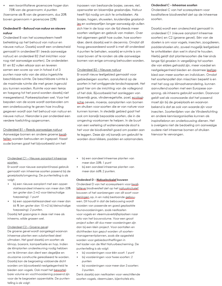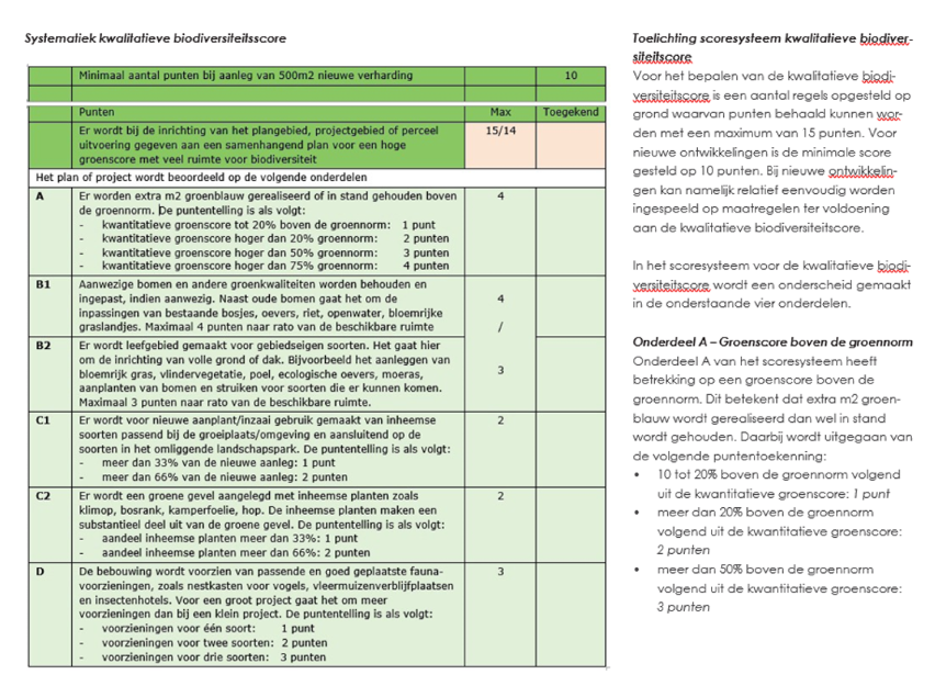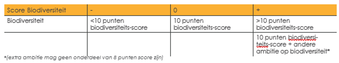 Indien 10 punten op de kwalitatieve biodiversiteitsscore wordt behaald, wordt op dit thema een 0 gescoord.