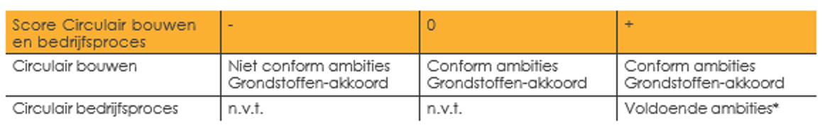 De basis voor de beoordeling van dit thema is de fase van bouwen en ontwikkelen. Indien bij die fase wordt voldaan aan bovengenoemde ambities, wordt op dit thema minimaal een 0 gescoord (ongeacht het bedrijfsproces). Uitgangspunt hierbij is het genoemde grond- stoffenakkoord. Indien hier niet aan kan worden voldaan, dient te worden gemotiveerd waarom niet. Met een geldige motivatie, kan mogelijk alsnog een 0 op dit thema worden gescoord.