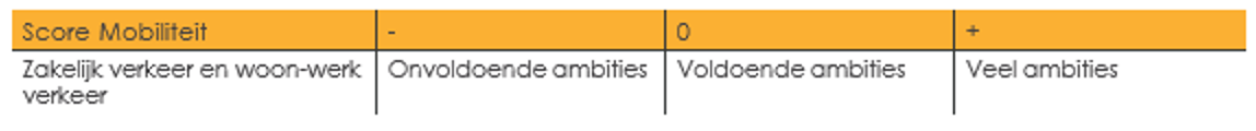 Indien zowel op woon-werkverkeer als op zakelijk verkeer veel ambities worden uitgesproken die leiden tot een zeer duurzame mobiliteit, is het mogelijk om op dit thema een + te scoren.