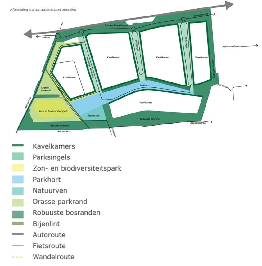 Het circulair landschapspark is opgebouwd uit bestaande en nieuw toe te voegen land- schappelijke structuren. Het huidige landschap heeft weinig elementen met cultuurhistorische waarden. De ruilverkaveling heeft het land schap genivelleerd. De bestaande waardevolle landschappelijke lijnen Raktstraat en Koksteeg en een aantal kleinere elementen, zoals een klein bos aan deWeerscheut en een landbouwpad, dat loopt vanaf de Koksteeg richting Weerscheut, zijn integraal opgenomen in het circulair landschaps- park. Ze zijn onderdeel van het landschapspark, hebben een nieuwe betekenis gekregen en geven structuur aan het stedenbouwkundig plan. Daardoor blijven ze beleefbaar en maken ze onderdeel uit van het landschap en de omgeving en wordt de ontginningsgeschiedenis afleesbaar gemaakt. Het bedrijventerrein wordt ingekaderd door de Ruitersdam met haar houtopstanden en in het verlengde daarvan de Zoggelsestraat, de laanbeplanting aan de Weerscheut, de Bosschebaan met haar bosschages parallel aan de A59 en de watergang aan de oostzijde. Ze maken onderdeel uit van de landschappelijke inpassing van het terrein. De bestaande structuren worden in belangrijke mate behouden en versterkt met (opgaande) groenstructuren.