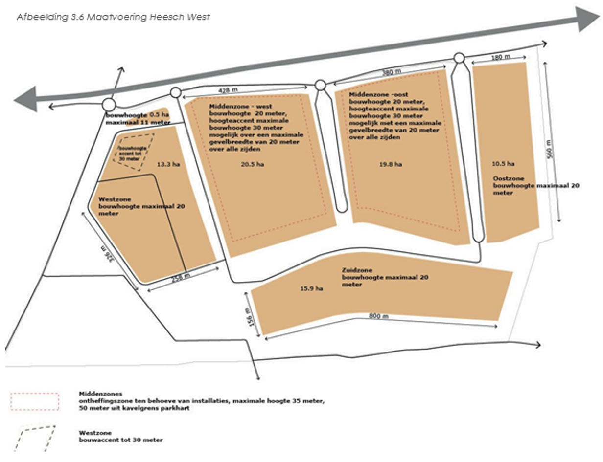 In afwijking daarop is het mogelijk om in de noordwest hoek van de westzone bebouwing op te richten tot 30 meter (zie afbeelding 4.3). Een hogere bebouwing is daar gewenst om de herkenbaarheid en de uitstraling van het bedrijventerrein Heesch West te vergroten. Om de ruimtelijke uitstraling van deze locatie voldoende tot zijn recht te laten komen wordt hier een minimale bouwhoogte aangehouden van 20 meter.