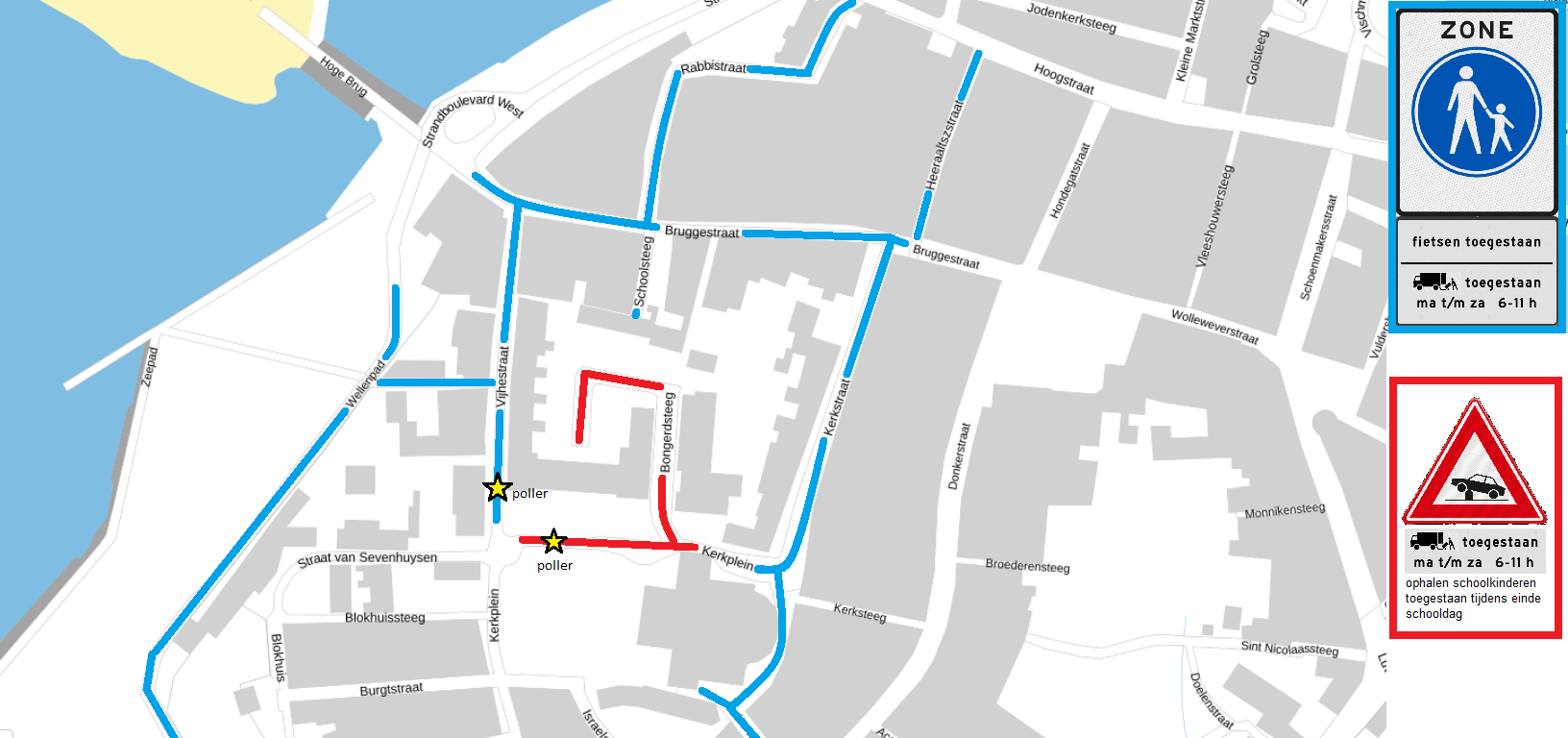 Het uitgevoerde onderzoek en het participatieproces heeft geleid tot een variant waarbij de Bruggestraat, Vijhestraat, Buiten de Bruggepoort, Wellenpad, Schoolsteeg, Rabbistraat, Korte Kerkstraat, Kerkstraat, Achterom, Heeraaltszstraat en Blauwverversteeg worden aangeduid als voetgangersgebied. Dit sluit aan bij de bestaande situatie op de Markt en de boulevard. Fietsen is toegestaan. Gemotoriseerd verkeer (laden en lossen) is toegestaan op maandag t/m zaterdag tussen 6 en 11 uur. Buiten venstertijden zijn snorfietsers en bromfietsers ook niet toegestaan. We kiezen voor een aanduiding als voetgangersgebied omdat dat het karakter van de straten het beste duidt. Genoemde verkeersgroepen zijn (al dan niet binnen tijdvensters) toegestaan, maar dienen zich aan te passen aan het verkeersbeeld ter plaatse.