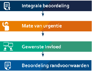 Beoordeling randvoorwaarden: vanuit de bovenstaande drie aspecten bepalen we welke rol onze voorkeur heeft. De voorkeursrol kan om meerdere reden niet mogelijk of niet wenselijk zijn. We beoordelen de randvoorwaarden die nodig zijn om de gewenste rol uit te kunnen voeren. De beoordeling van de randvoorwaarden kan tot heroverweging van de voorkeursrol leiden.