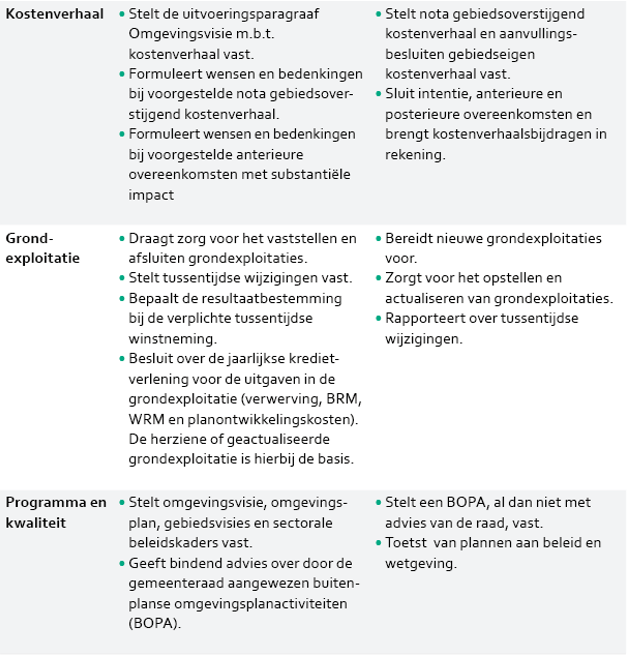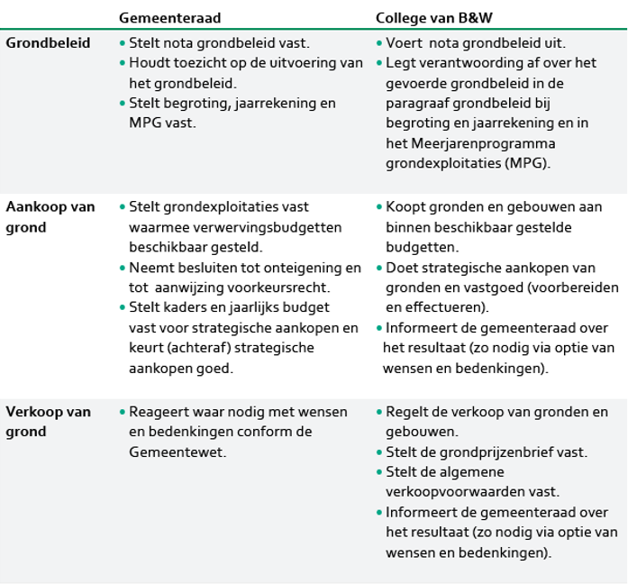 De raad heeft bij alle vormen van grond-beleid een formele rol bij de vaststelling van een omgevingsplanwijziging of bij door de raad aangewezen buitenplanse omgevingsplanactiviteiten (BOPA). Voor zover het gaat om BOPA’s voor niet aangewezen gevallen is het college bevoegd. Ook is het college op grond van de Gemeentewet bevoegd tot het aangaan van een intentie en een anterieure overeenkomst. Indien uitoefening van die bevoegdheid ingrijpende gevolgen kan hebben voor de gemeente betrekt het college vooraf de gemeenteraad bij de besluitvorming. Bij grondbeleid met een ontwikkelende rol stelt de raad de (geactualiseerde of herziene) grondexploitatie als financieel kader vast. De raad wordt over gebiedsontwikkeling(en) met substantiële impact vroegtijdig geïnformeerd en er wordt vroegtijdig tussen raad en college afgestemd over kansen en bedreigingen en de vraag hoe daarmee om te gaan. De vier fasen zijn hierna schematisch in beeld gebracht.