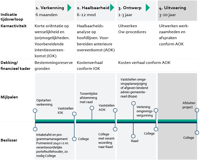De vraag óf gestart wordt met een verkenning wordt afgewogen op ambtelijk niveau (de intaketafel, het programmamanagement Purmerend 2040 en/of de regietafel) in overleg met de verantwoordelijk portefeuillehouder(s) en zo nodig het college. De gemeente begeleidt het initiatief vervolgens verder in de richting van een aanvraag omgevingsvergunning. Indien daarbij sprake is van een wijziging van het omgevingsplan heeft een gecoördineerd besluit (i.c. wijziging van omgevingsplan in combinatie met aangevraagde omgevingsvergunning) de voorkeur. Bij gebiedsontwikkeling(en) is het Projectmanagementbureau aan zet. Om de verwachtingen helder te verwoorden en het project duidelijk af te bakenen wordt al bij de start ervan een projectopdracht opgesteld.