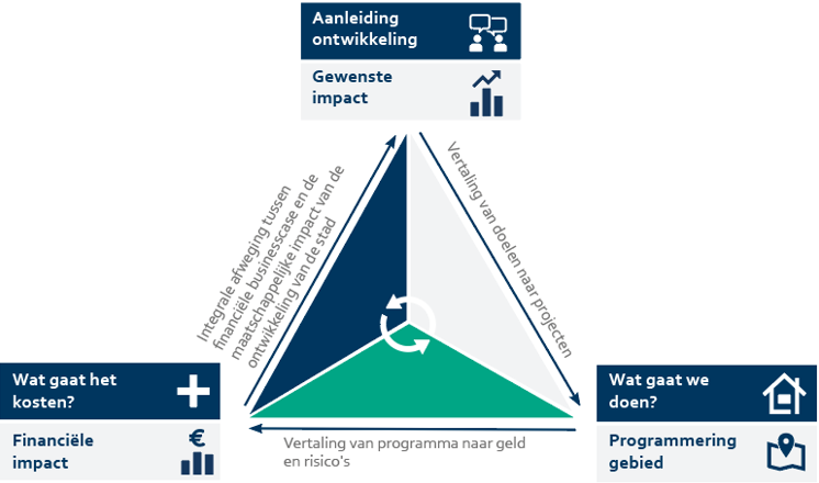 Een gebiedsontwikkeling moet het beste resultaat voor de gemeente opleveren. Maar wanneer is sprake van het beste resultaat? Die vraag is niet eenvoudig te beantwoorden omdat een gebiedsontwikkeling altijd uit verschillende elementen bestaat: ruimtelijke, maatschappelijke en financiële. Ook is het belangrijk de samenhang met andere plannen en ambities en met de bestaande situatie op te zoeken, de dwarsverbanden te zien en te bepalen hoe met publiek geld het meest effectief de gewenste doelen kunnen worden bereikt. Er is dus altijd een belangenafweging noodzakelijk. Figuur 1 geeft dit schematisch weer.