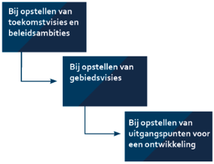 Door te benoemen waarom een ontwikkeling nodig is, kunnen we bepalen welke maatschappelijke waarden we in elk geval in de impact ervan terug willen zien. Hiermee kunnen we kaders aangeven voor alle aspecten van een gebiedsontwikkeling, zoals de gewenste ruimtelijke kwaliteit van het gebied, de programmering en de noodzakelijke voorzieningen. De weerslag daarvan wordt opgenomen in een nota van uitgangspunten en/of een projectopdracht. Die levert ons een totaalbeeld van de huidige situatie en van wat we willen bereiken.