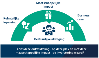 Nadat het maatschappelijk en het financieel rendement in beeld zijn gebracht, kunnen we deze tegen elkaar afwegen. De beoordeling van een ontwikkelplan is maatwerk. De voorwaarden die we aan de impact stellen, bepalen we situationeel op basis van de omstandigheden, het nut en de noodzaak van een plan. We gebruiken daarvoor het afwegingskader in de onderstaand figuur: