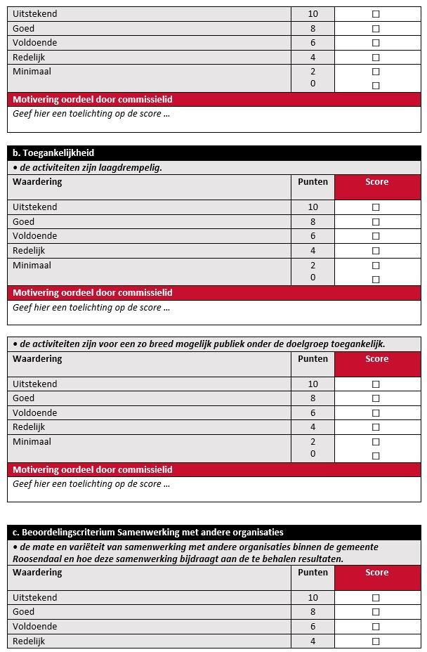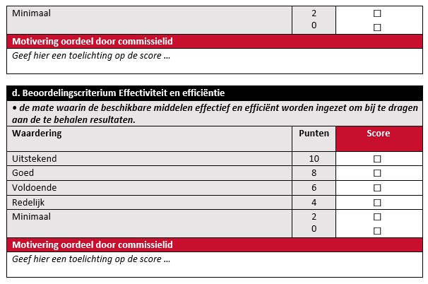 Aan de in het eerste lid vermelde criteria wordt een score toegekend met toepassing van een wegingsfactor zoals vermeld op het bijgevoegde vastgestelde beoordelingsformulier. Dit beoordelingsformulier maakt onderdeel uit van deze subsidieregeling.