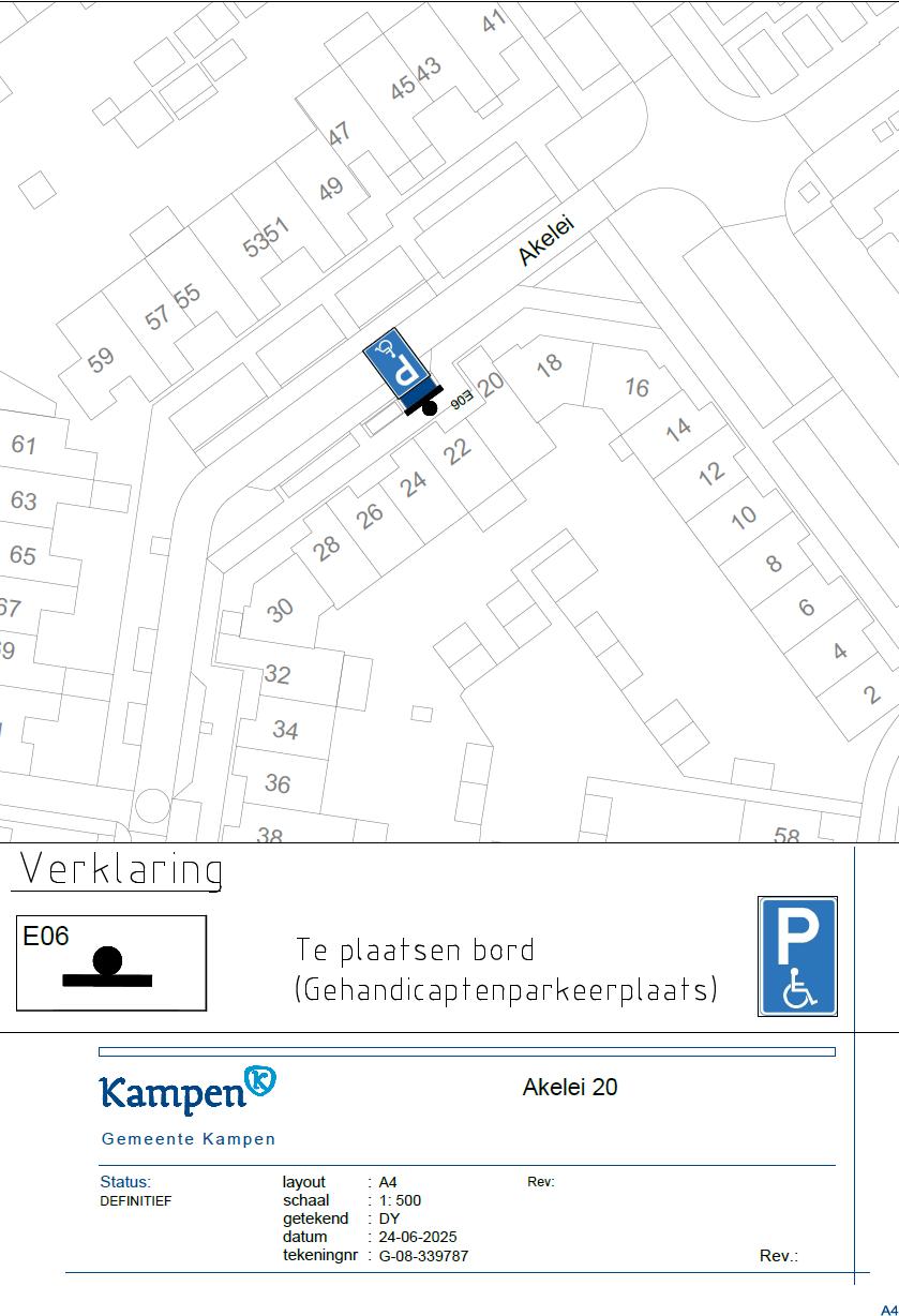 - nabij de Akelei 20 in Kampen één openbare parkeerplaats aan te wijzen als gehandicaptenparkeerplaats op kenteken door het plaatsen van een verkeersbord conform het model E6 van bijlage 1 RVV 1990 inclusief onderbord met het kenteken van het voertuig;