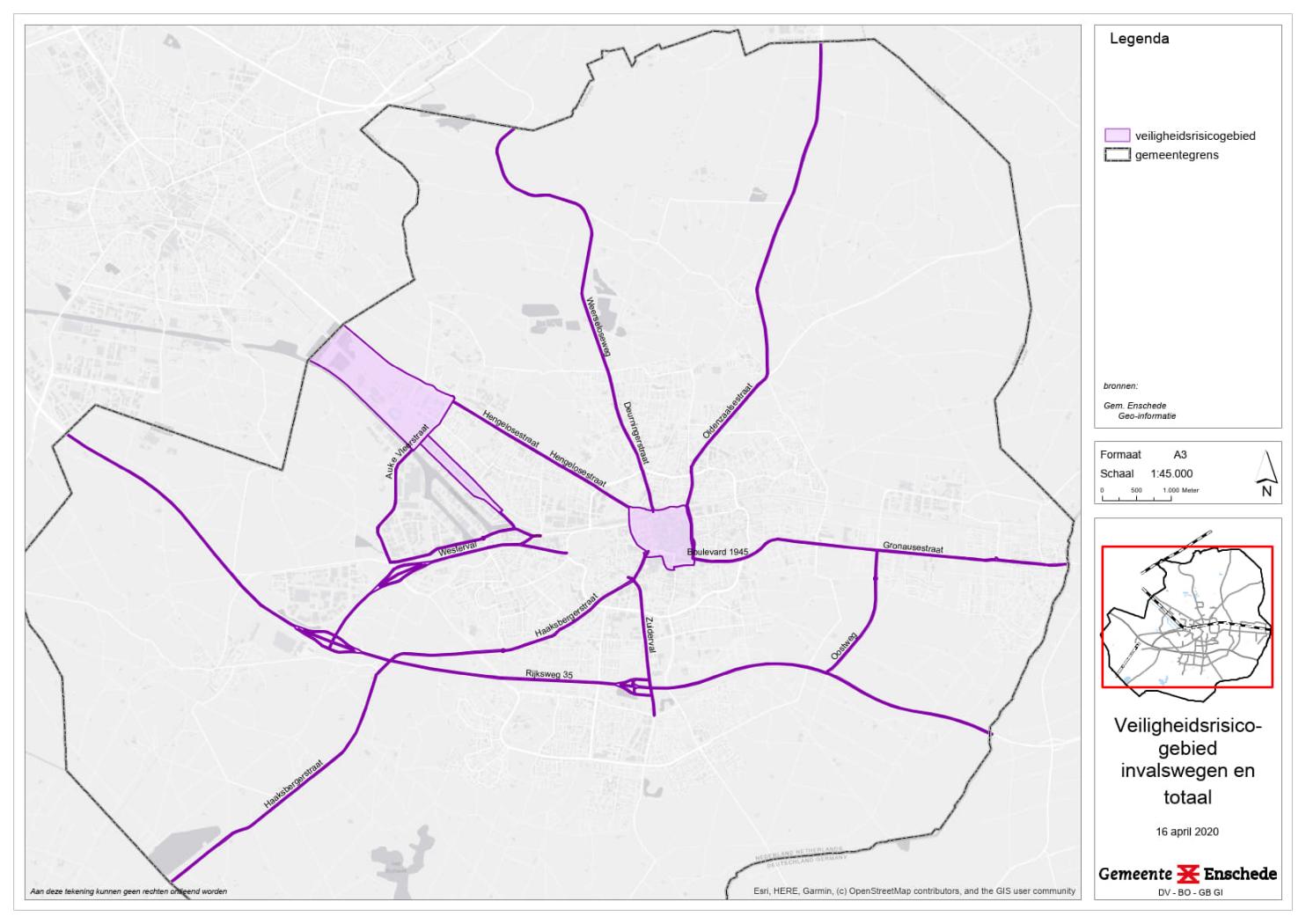 De invalswegen van Enschede, zijnde de A35/N35, de Haaksbergerstraat/N18, de Oldenzaalsestraat, de Weerseloseweg, de Deurningerstraat, de Gronausestraat, de Boulevard 1945 tussen de Oldenzaalsestraat/Mooienhof en Gronausestraat, de Oostweg, de Zuiderval, de Westerval, de Auke Vleerstraat, de Hendrik ter Kuilestraat, de Parkweg (tussen de Westerval en de Lambertus Buddestraat) en de Hengelosestraat, alle straten inclusief op- en afritten en naastgelegen parkeerplaatsen en voor zover gelegen binnen de gemeentegrens.