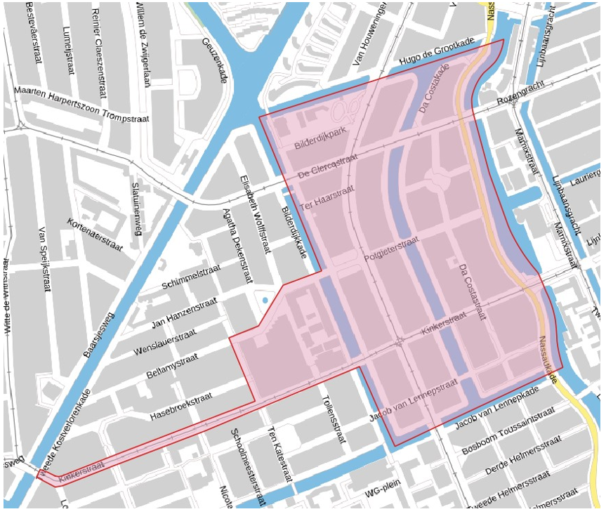 het hierna volgende gebied aan te wijzen als een (algemeen) overlastgebied, waarbij het gebied wordt uitgebreid met het aangrenzende gebied in de Kinkerstraat en de omgeving van de Hannie Dankbaarpassage, waar de bevoegdheid op grond van artikel 2.9 van de APV kan worden uitgeoefend;