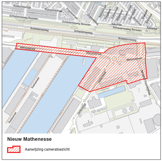 Het haven- en industrieterrein Nieuw Mathenesse ondergaat een transformatie naar een gemengd stedelijk gebied met zowel woon- als werkfunctie. Dagelijks meren veel schepen aan in de Merwehaven en er is een opvanglocatie voor statushouders. Het cameratoezicht is met name gestationeerd rondom de haven, aangezien hier de meeste bedrijvigheid is. Beoordeeld is dat het cameratoezicht in het gebied een positieve invloed op de veiligheid in en rond het gebied heeft. Zo wordt sociale veiligheid voor de statushouders geboden, is er bescherming tegen personen van buitenaf met verkeerde intenties, wordt de heterdaadkracht bij strafbare feiten versterkt en kan cameratoezicht een ontmoedigend effect hebben voor kwaadwillende personen.
