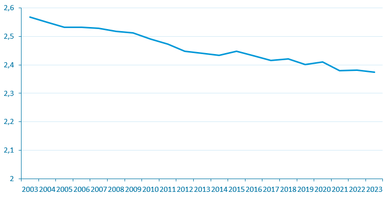 Figuur 3: Gemiddelde huishoudensomvang gemeente Woerden, 2003-2023